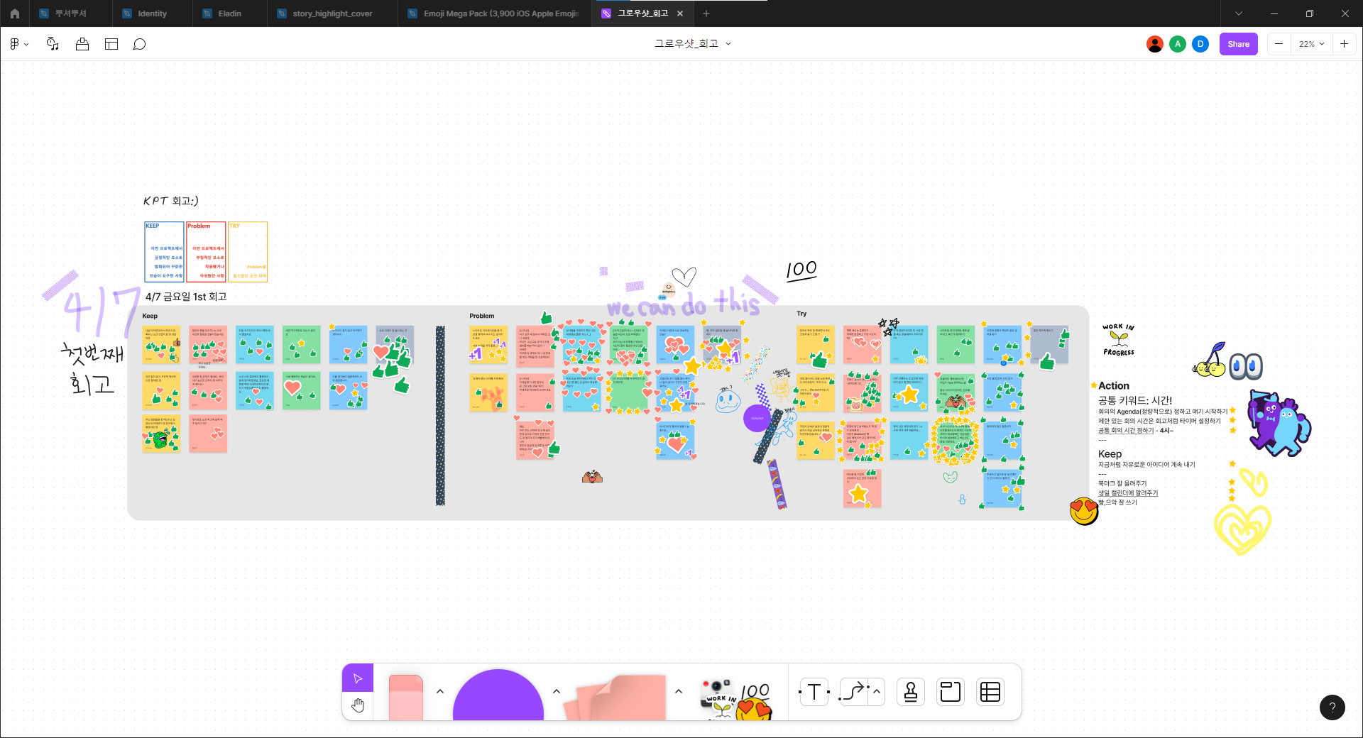 아기자기한 우리 팀 회고 해야지해야지 하고 해본 적 없던 KPT 회고.. 드디어 해보았다 그것도 Figjam으로!