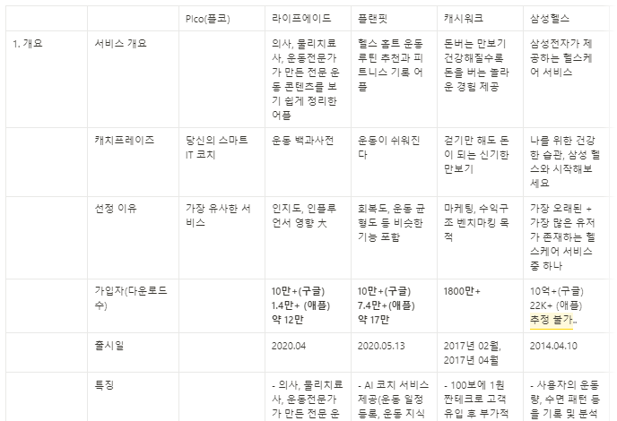 이런 식으로 팀원마다 하나씩 맡아 기존 서비스 분석을 진행했다. 이를 ppt에 녹여 준비하고 조별 발표를 진행했다.