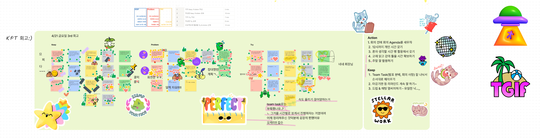 누가누가 더 화려한 스티커 찾나 ㅇ3ㅇ 이번주 금요일에도 저번주와 저저번주처럼 KPT 회고를 진행했다.