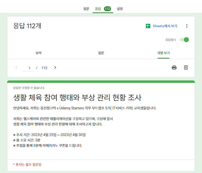구글폼을 활용하여 문항을 제작·수정하고 총 111명을 대상으로 3일간 설문을 진행했다.