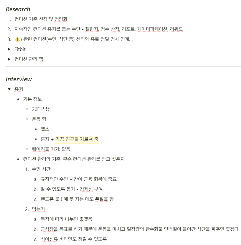 각 팀원마다 소수의 유저를 대상으로 인터뷰를 진행했음에도 다양한 아이디어와 인사이트가 도출되어 흥미로웠고, 도움이 많이 되었다.